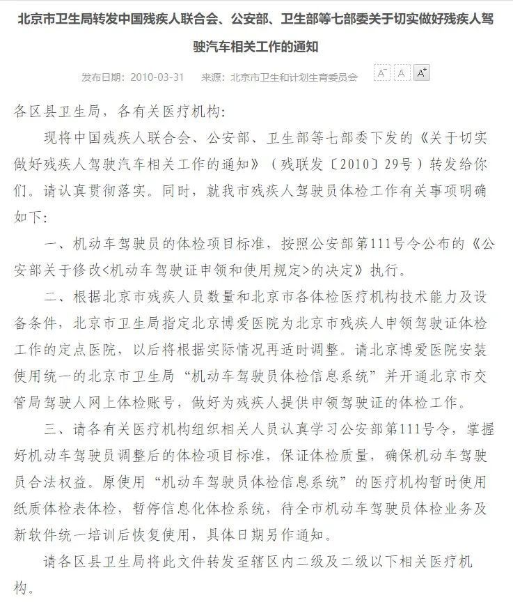 按照中国残疾人联合会、公安部、卫生部等七部委下发的《关于切实做好残疾人驾驶机动车相关工作的通知》(残联发【2010】29号)通知要求,北京博爱医院将作为全市指定残疾人驾驶员体检的定点医院,为残疾人提供申领驾驶证的体检工作。