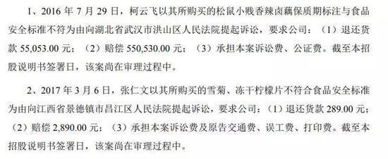 招股书还显示,2016年7月至2017年6月,三只松鼠曾因产品保质期标注与食品安全标准不符、产品不符合食品安全标准、标有“促销价”非促销误导消费、标示脂肪含量与实际含量不同、含糖量不符合等级要求、配料未在标签中标注等问题先后被多名消费者起诉,涉及产品包括卤藕、雪菊、冻干柠檬片、奶油味瓜子、和田骏枣、鱿鱼丝等。