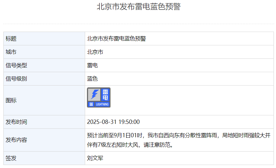 8月31日19:50,北京发布雷电蓝色预警:预计当前至9月1日1时,我市自西向东有分散性雷阵雨,局地短时雨强较大并伴有7级左右短时大风,请注意防范。
