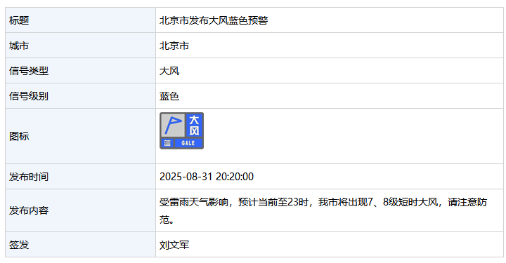 20时20分,北京发布大风蓝色预警:受雷雨天气影响,预计当前至23时,我市将出现7、8级短时大风,请注意防范。