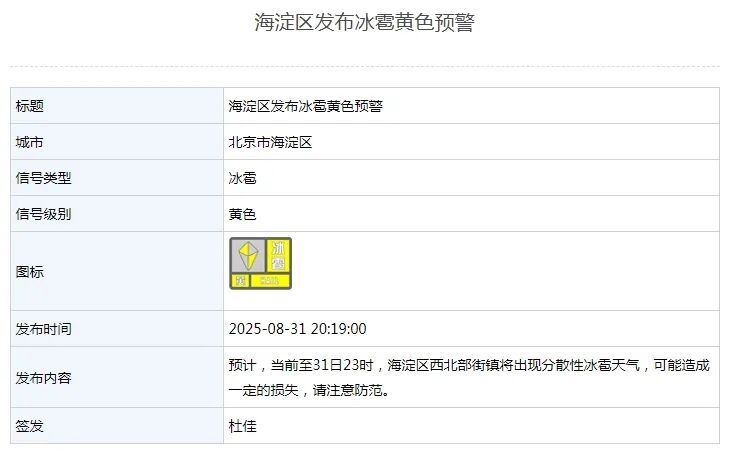 此外,20时19分,海淀区发布冰雹黄色预警: