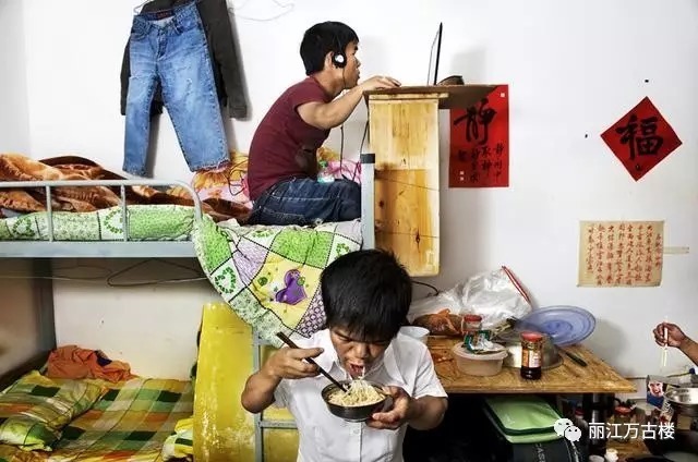 外人的异样目光始终存在,“小人国”对于这个少数群体来说,不仅仅是工作场所,更是一个有归属感的社区。他们在这里彼此陪伴、抱团群暖。图为“小人国”员工宿舍里,下铺的人埋头吃面,上铺的人戴着耳机上网。