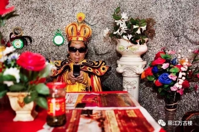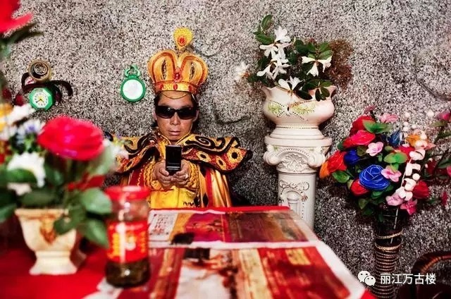 这座主题公园是在“皇帝”和“皇后”的统治下运营的。图为表演间隙,皇帝在看手机。