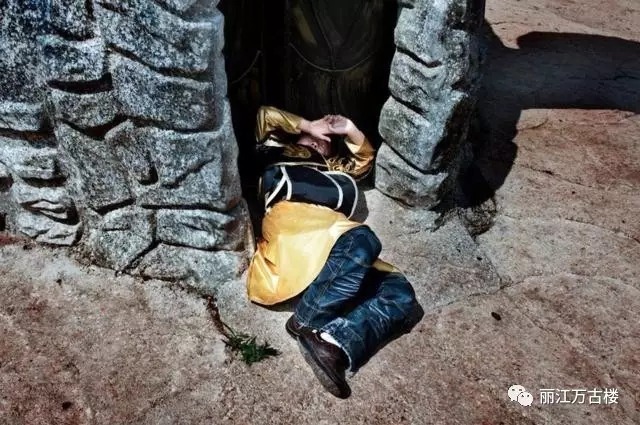 小人们穿着定制的服装,扮演天使、国王,甚至还有军队。图为一位穿着表演服的工作人员躺在“城堡”前晒太阳。
