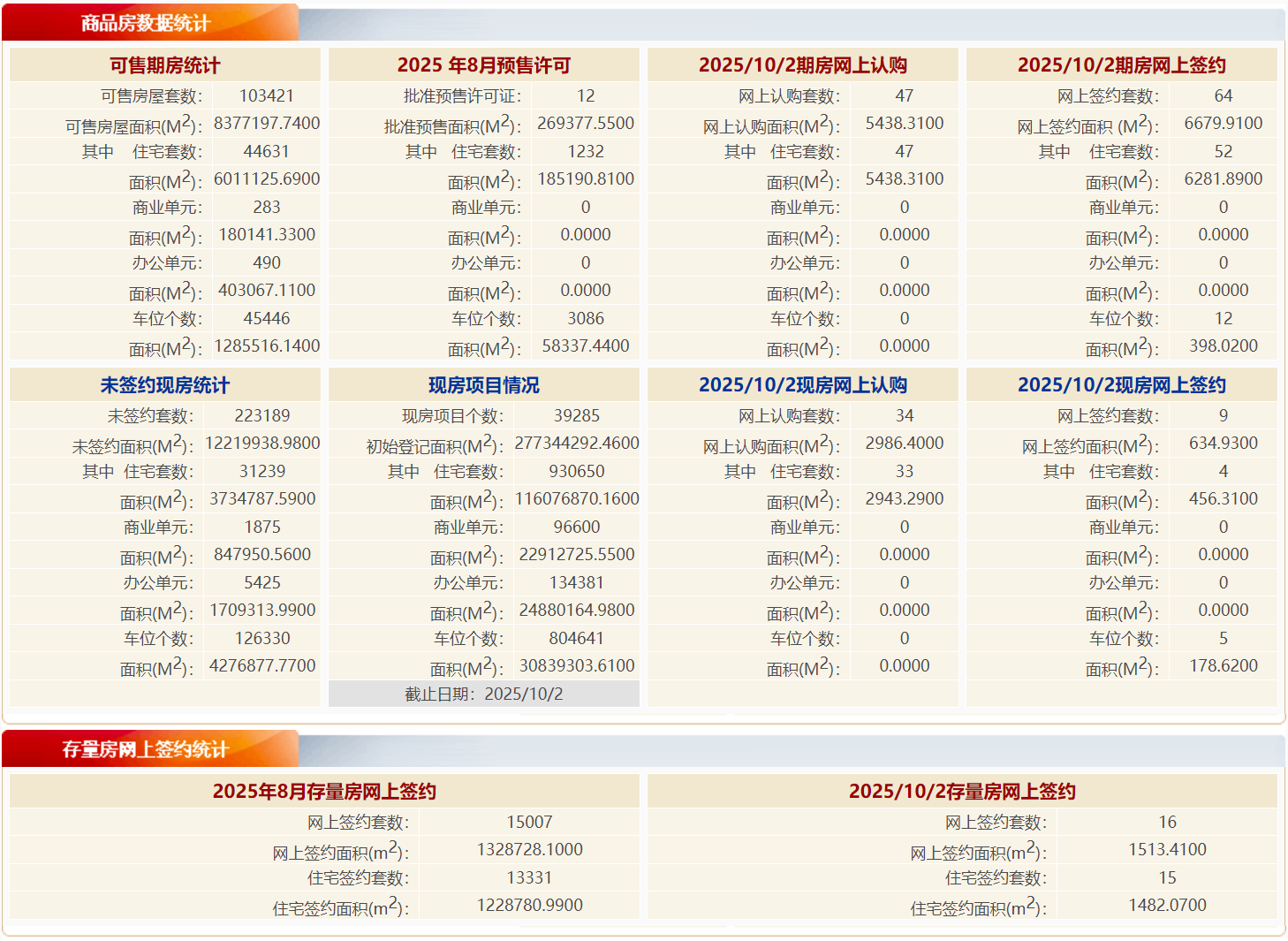 根据北京市住房和城乡建设委员会数据:10月2日,北京新房住宅网签56套,网签面积约8,209.72㎡;二手房住宅网签15套,网签面积约6,738.2㎡。