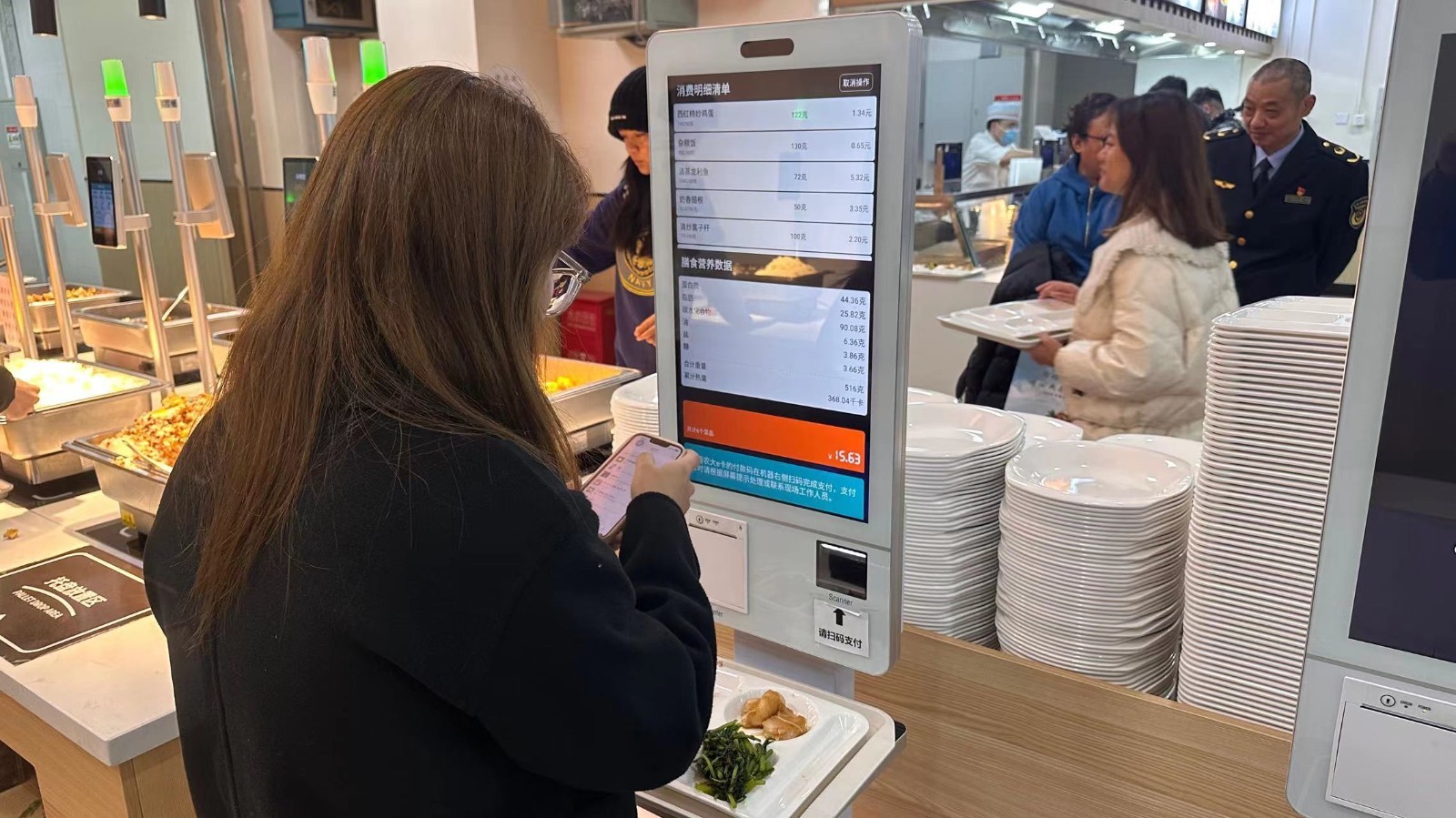 中国农业大学的“神奇”食堂集“科技”与“美味”于一身——是北京首家运用AI识别功能无感支付、将传统风味特色档口与自助选餐一体化结合的智慧食堂。师生用托盘取餐过程中,屏幕实时显示取餐量、膳食营养数据与金额。