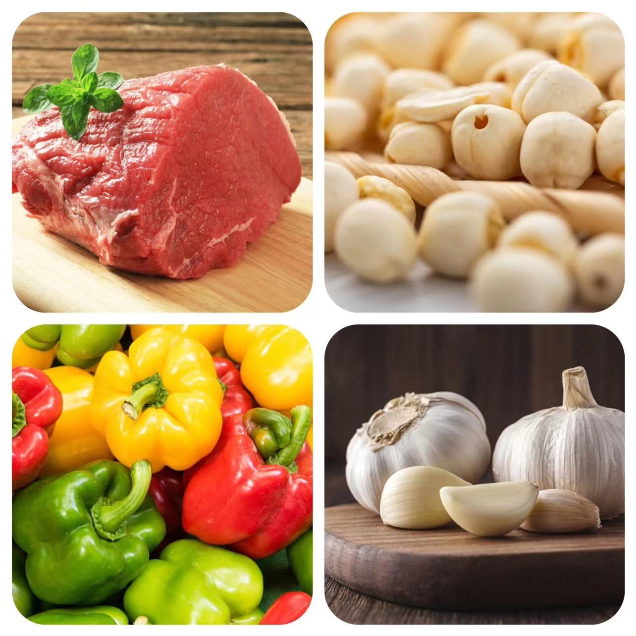 牛眼肉、莲子、洋葱、香菜、蒜、洋葱、彩椒、生抽、黑胡椒、黄酒、淀粉、蚝油、黑椒酱、白糖、水淀粉