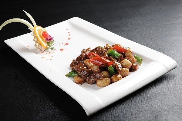 5、煸炒:牛肉二次入锅,和金蒜、莲子煸炒均匀,倒入之前调制好的秘制芡汁,关火用余温让芡汁和食材充分融合,起锅前放入洋葱、彩椒即可。