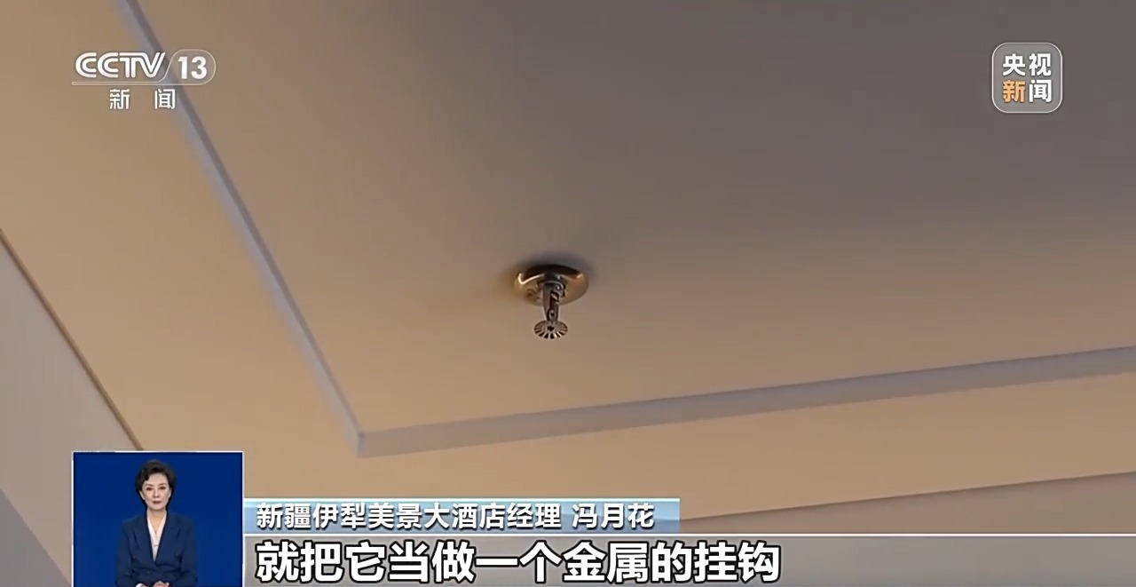 新疆伊犁美景大酒店经理 冯月花:有大部分的客人,他不认识消防喷头,都不知道它的作用,就把它当作一个金属的挂钩,后果他没有办法去想象的。