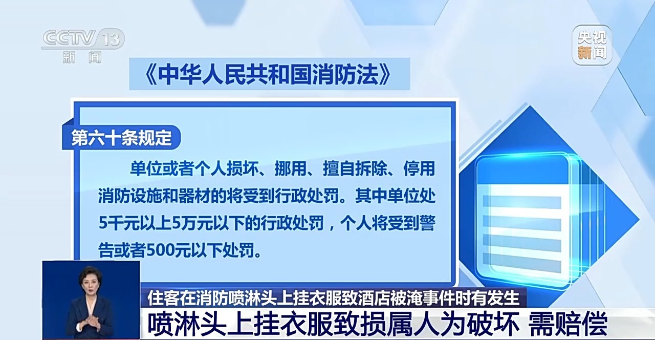 据消防人员介绍,在酒店喷淋头上挂衣服导致的损坏,一般按照消防法相关规定予以定责。