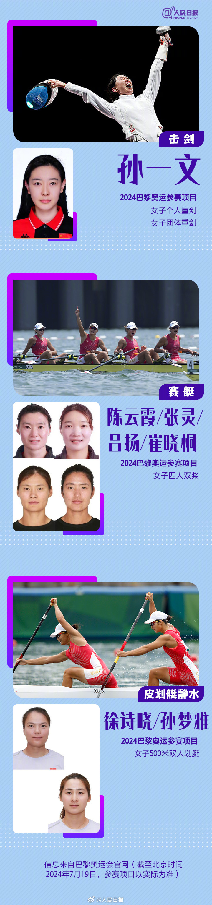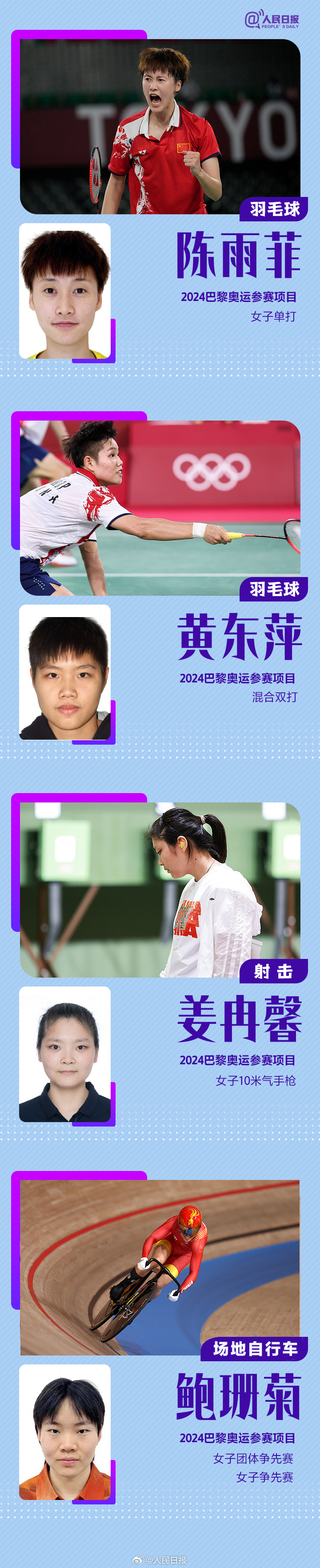 巴黎奥运会中国体育代表团共405位运动员,包括42名奥运冠军。巩立姣、马龙、汪顺、朱婷、孙颖莎、全红婵……不论是五战奥运的老将,还是冲劲十足的新人,这个夏天,他们将为中国军团续写辉煌。TEAM CHINA向巴黎,为奥运健儿加油!