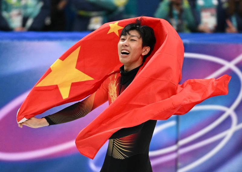 2月12日,孙龙在比赛后身披国旗庆祝。新华社发