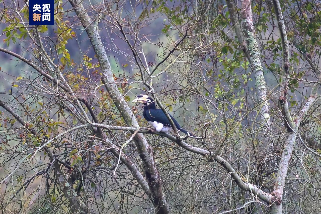 2月17日上午,有摄影爱好者在广西靖西市龙潭湿地公园内拍到国家一级保护动物冠斑犀鸟。冠斑犀鸟警惕性非常高,一旦察觉到有动静就会立刻飞走,很难近距离接近。