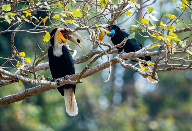 犀鸟是热带森林的珍稀旗舰物种。中国迄今记录有5 种犀鸟:双角犀鸟、白喉犀鸟、棕颈犀鸟、冠斑犀鸟、花冠皱盔犀鸟。它们分布范围狭窄,种群数量稀少,是十分珍贵美丽的鸟儿。