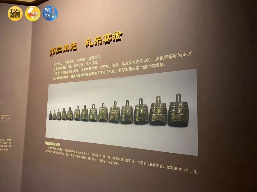 展览展出海昏侯国遗址出土珍贵文物128件(组),包含金器、玉器、青铜器等多个品类,其中包括备受瞩目的马蹄金、麟趾金,珍贵的鎏金青铜编纽钟更是成套外展,一套14件纽钟大小不一、排列有序,前13件均有精美鎏金纹饰,再现西汉礼乐制度。另外,展品中的青铜当卢、鎏金青铜当卢、筒形青铜器、青铜量、青铜博山炉、青铜剑等8件珍贵文物刚刚修复完成,是首次对外展出。