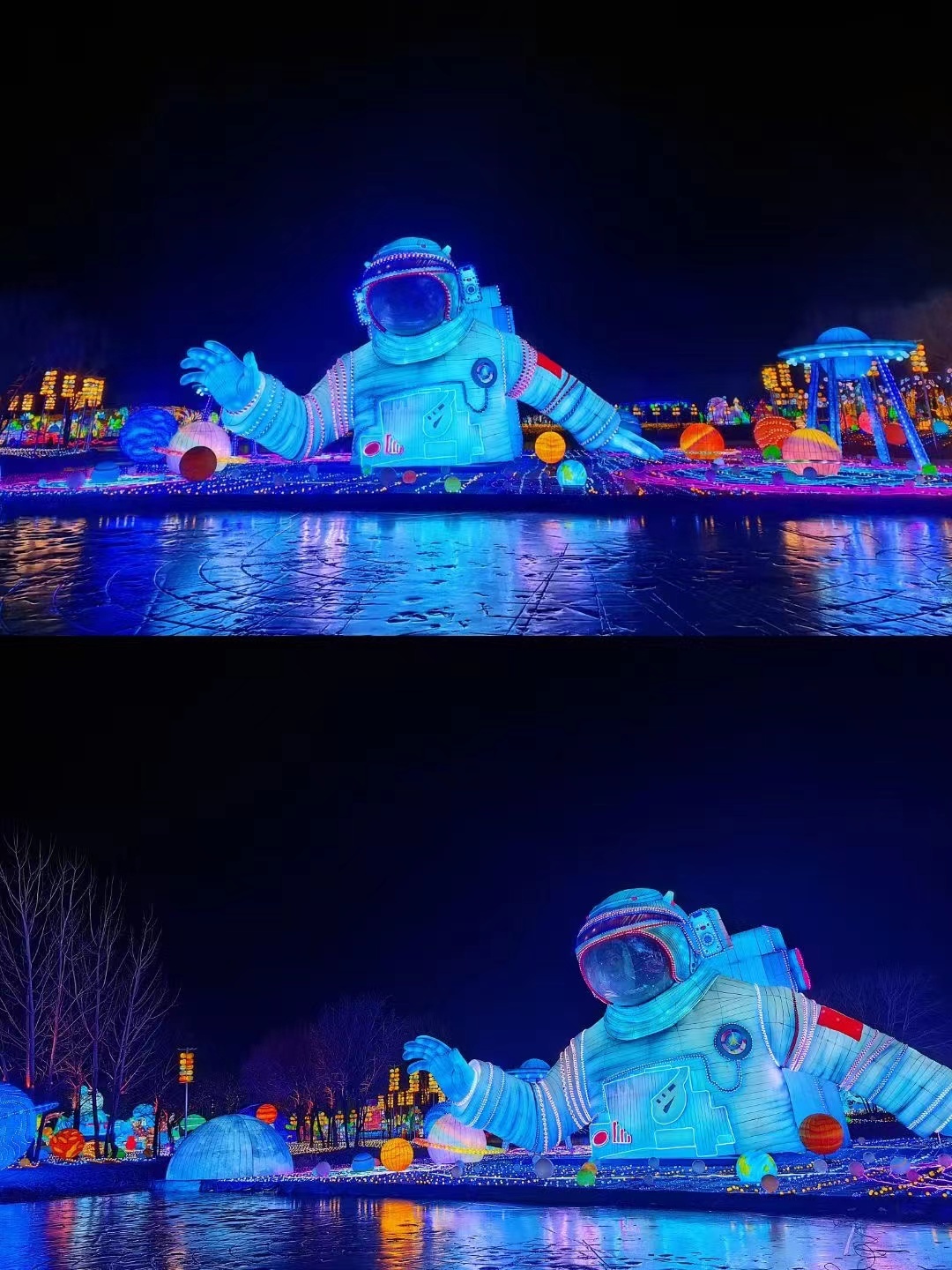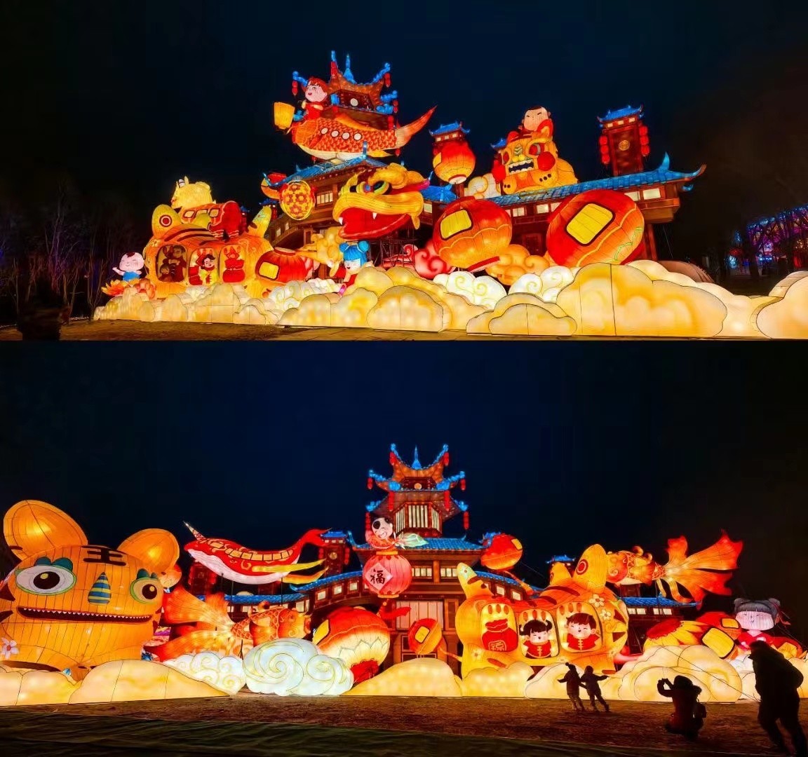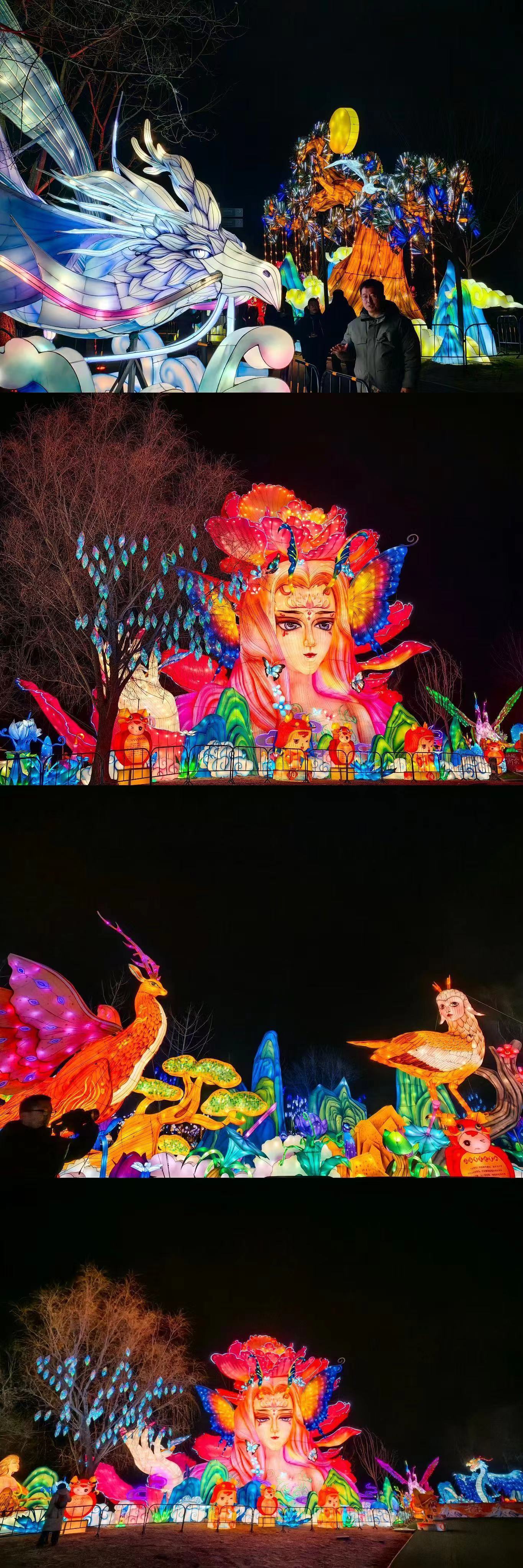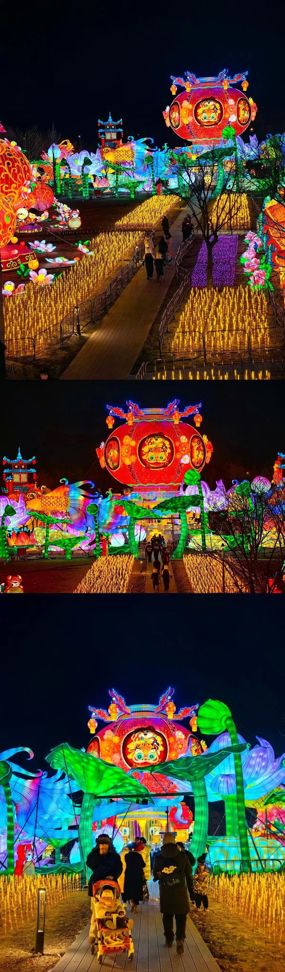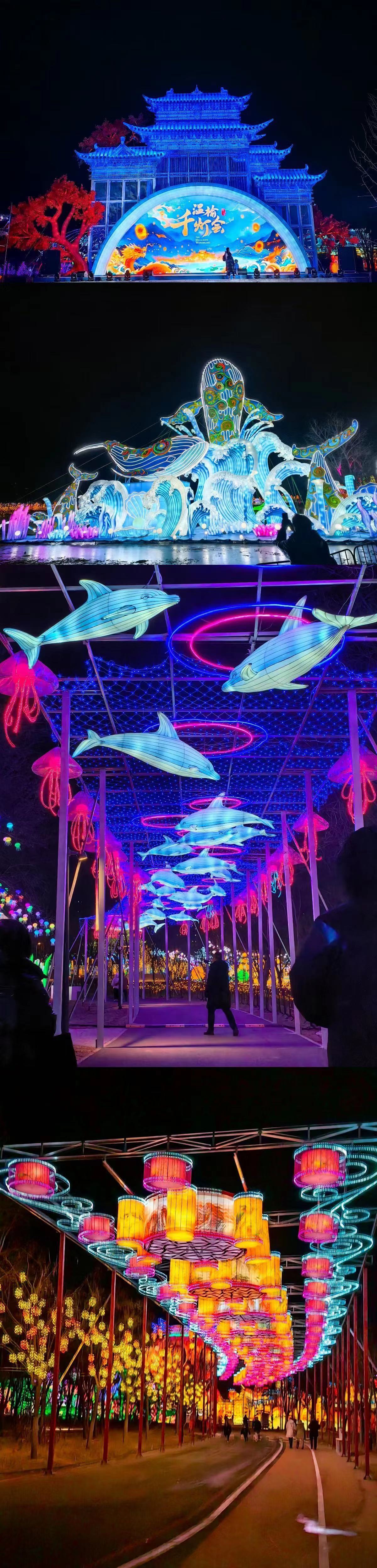 本次温榆千灯会拥有400亩的超大空间,以中国传统文化元素作为支点,设置“新春祈福”“祥龙贺岁”“温榆神话”“魔幻时空”“浩渺星际”“奇艺丛林”六大主题区域,展出11组大型灯组、154组中型灯组、261组小型灯组,包含氛围灯在内一共展出超过千组彩灯,每一盏彩灯都经过多道工序的打磨,饱含非遗工艺匠人匠心,通过“形、色、声、光”,将灯会的传统年味、国潮文化、未来科技完美融合。