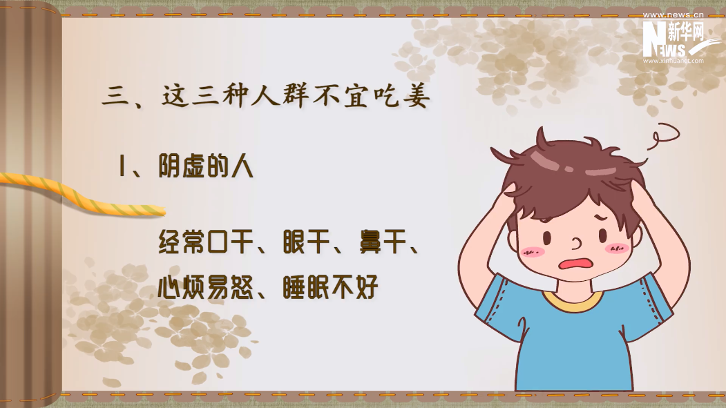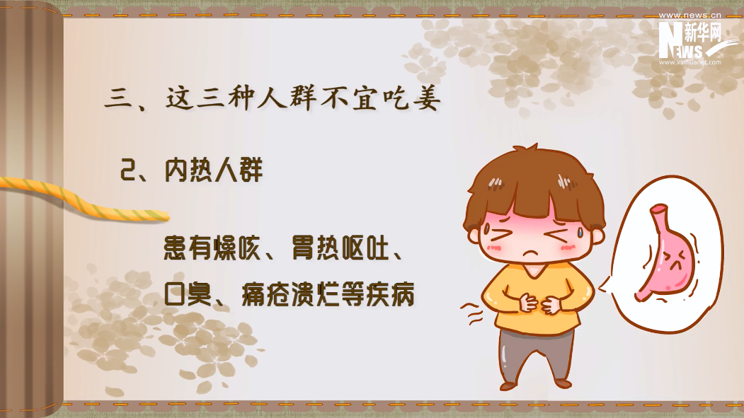 此外,如果是日常保健吃姜,一定要在早饭时吃。因为早晨正是气血流注阳明胃经之时,此时吃姜正好生发胃气,促进消化,且姜性辛温,能加快血液流动,有提神的功效;晚上和中午以后就不应该吃姜了。正午时分心经的气血最盛,此时吃姜,对于本身心火旺的人来说无异于火上浇油,心火过旺会引起咳喘痰热等症状。夜晚人体应该养阴,收敛阳气,此时吃姜会使人兴奋,无法安睡,刺激神经,影响心脏功能,郁积内火,耗肺阴,伤肾水。