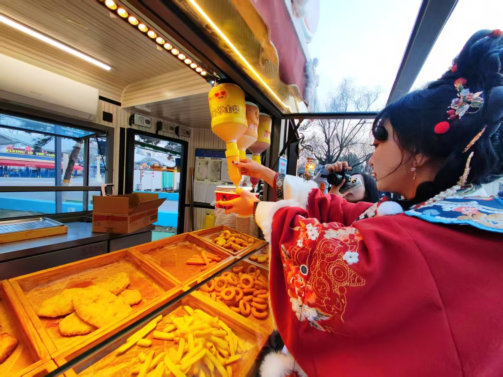 摩天轮舞台串烧表演;战鼓楼定点演出汇集战鼓、舞狮、大旗表演等多类技艺展示……每天十三场演出将为游客打造一个多元文化融合的视觉盛宴。本次庙会独具匠心,除了地道京味小吃,游客还将在这里品尝到世界风味。骑士广场中华美食区,特色京味茶馆再现艺人现场叫卖场景。音乐大道的东南亚小吃,西园公主花园欧班小站有各国经典西式小吃餐点,双趣广场20辆餐车在春节期间荟萃展示世界五洲各种小吃,多重选择供游客选购。