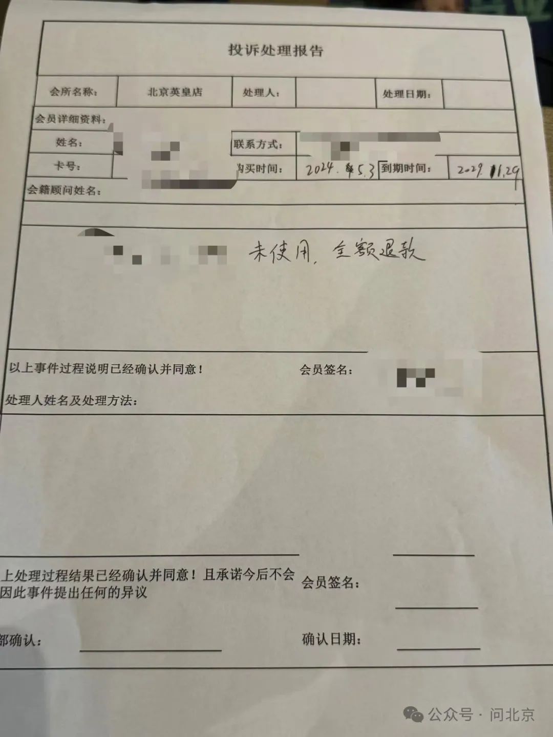 威尔仕健身北京英皇店闭店,消费者申请退款时填写的单子/受访者供图