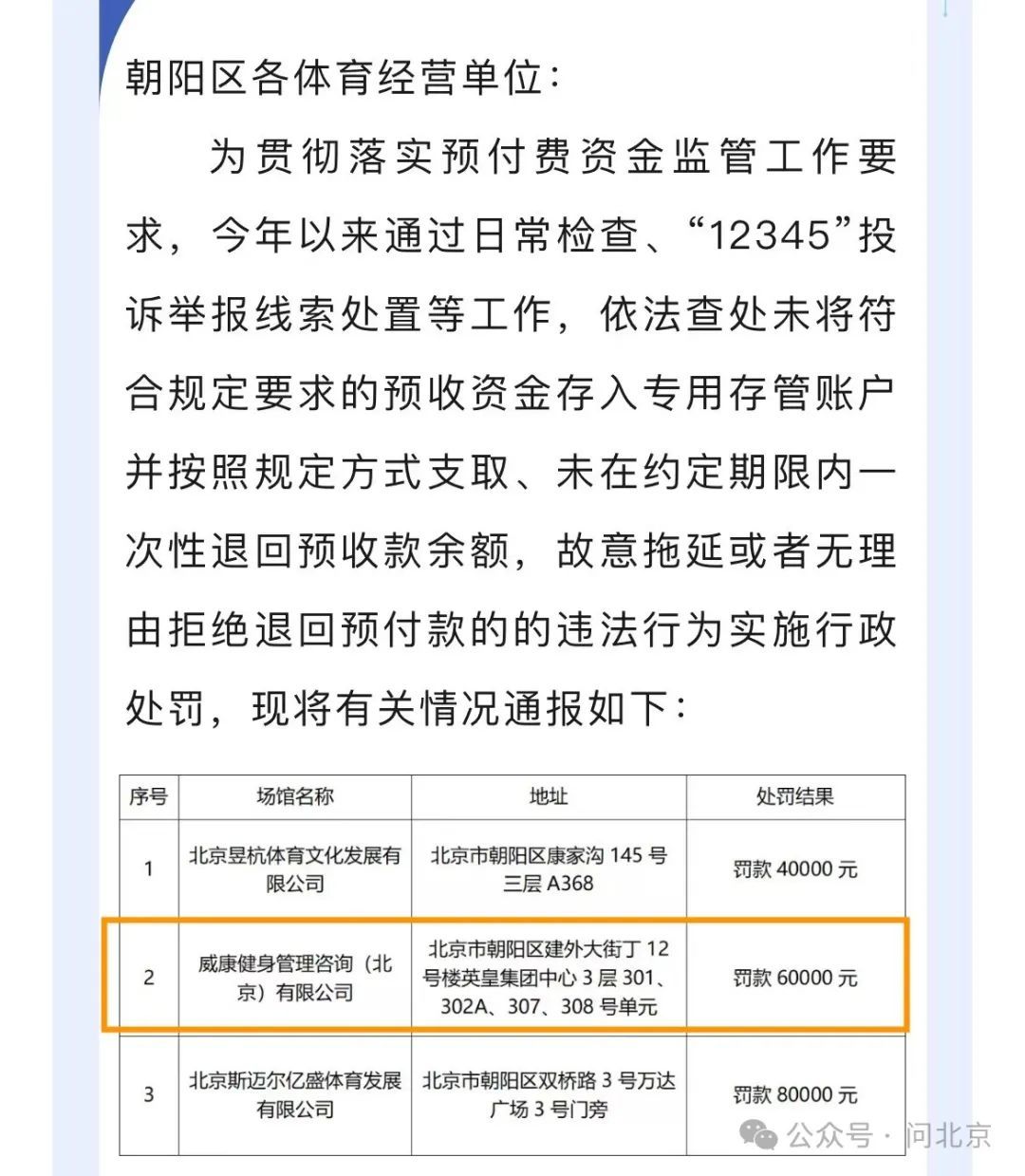 北京市朝阳区体育局对区域内体育经营单位违反预付费规定的行政处罚情况通报,其中包括威尔仕英皇店/朝阳区体育局微信公众号@健行朝阳 截图