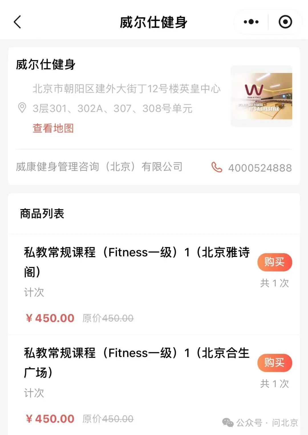 随后,记者在微信小程序预付管家上搜索到了威尔仕健身和威尔仕健身(悠唐中心店)两家商户。其中仅标注威尔仕健身的商户,显示的经营地址还在英皇中心,而下拉商品列表可以发现,这家门店的部分课程仅能在雅诗阁和合生汇店使用。于是,记者以消费者身份拨打了威尔仕健身雅诗阁店,询问预付管家中上架的课包购买后能否在门店正常使用,但销售人员表示,对这个监管平台一无所知,同时大力促销门店线下活动。