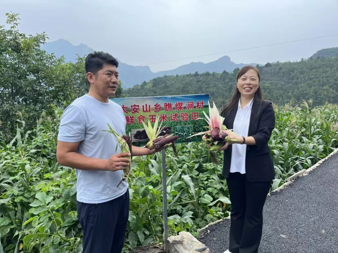 大安山乡水峪村第一书记王昊(左)和瞧煤涧村第一书记周新华(右)推广大安山鲜食玉米