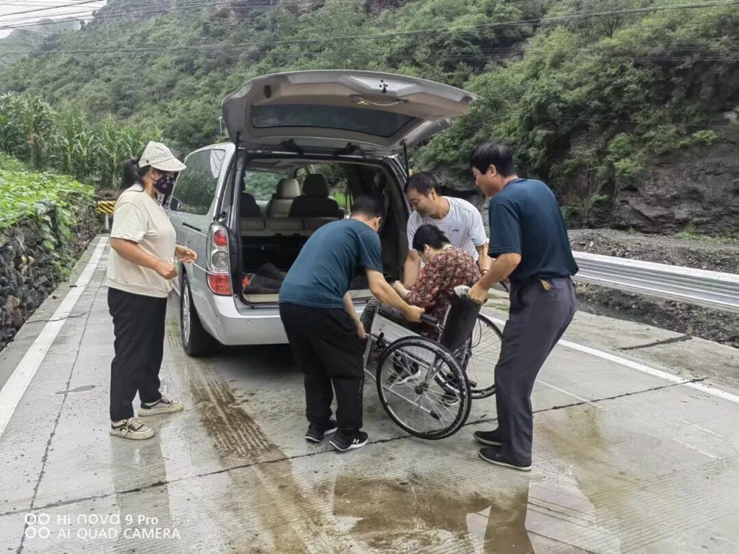 王金良(左二)汛期冒雨接盲人村民到安置点