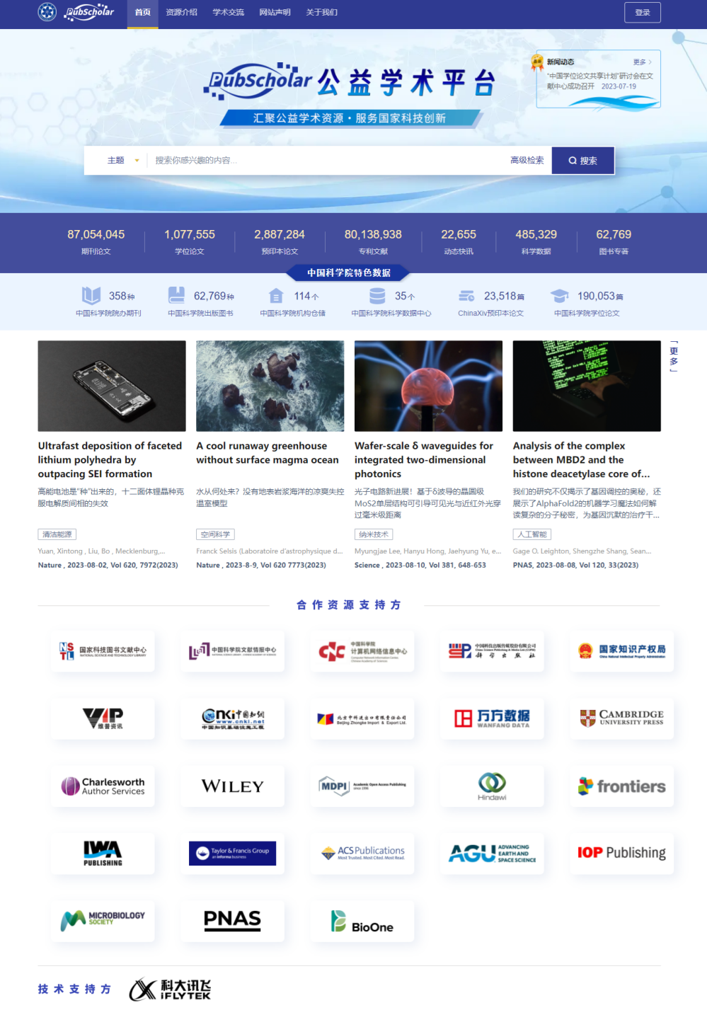 11月1日上午,“PubScholar公益学术平台”在京正式发布。平台旨在向全社会提供高质量的公益性学术资源,提供学术资源检索发现、内容获取和交流共享等基础服务。目前,平台可免费获取的全文资源量约8,000万篇,包含期刊论文、学位论文、专利文献、科学数据等。