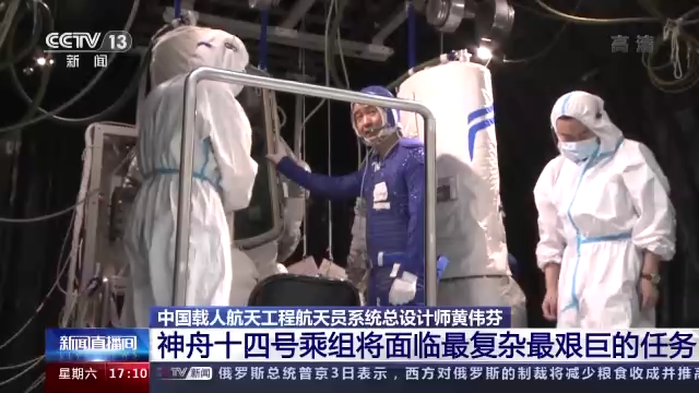 中国载人航天工程航天员系统总设计师 黄伟芬:神舟十四号飞行任务,是我们空间站建造阶段的首次载人飞行,它是承上启下的,意义非常重大。在长达6个月的飞行中,他们要经历极为复杂的飞行工况,首次进入问天、梦天两个实验舱,要对十几个科学研究的机柜进行安装、解锁和相关的测试,还要开展大量的科学研究和试验工作,所以他们这个乘组任务非常非常艰巨。