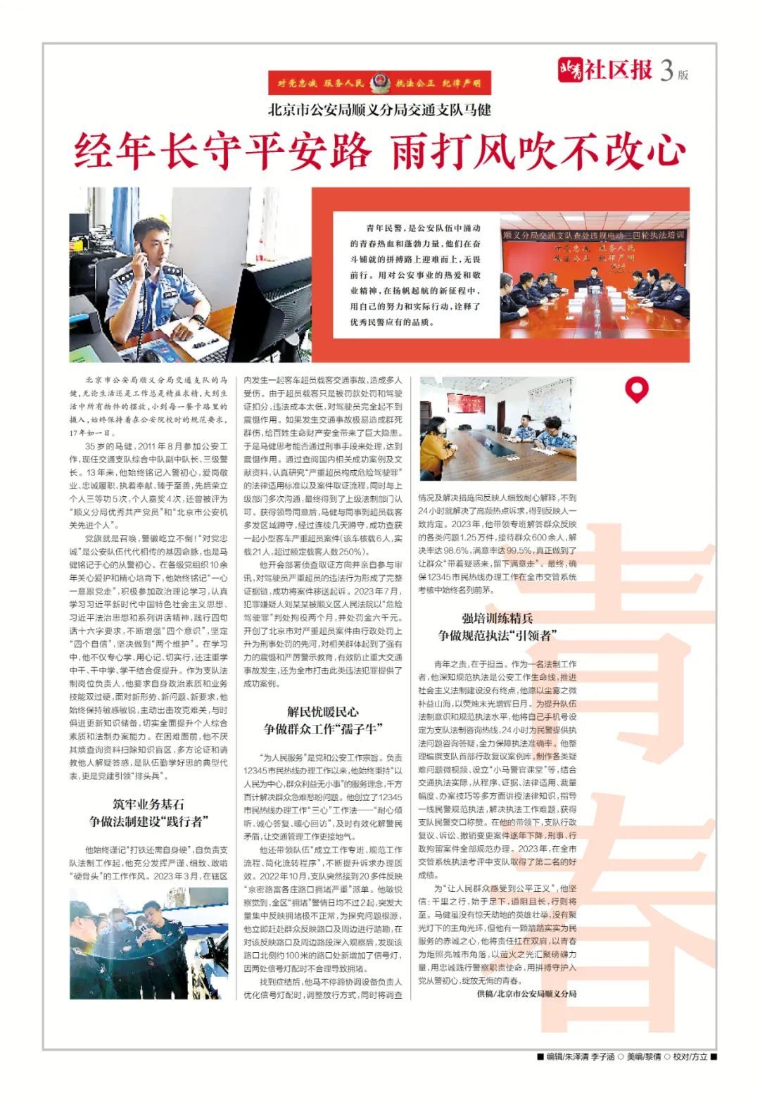 35岁的马健,2011年8月参加公安工作,现任交通支队综合中队副中队长、三级警长。13年来,他始终铭记入警初心,爱岗敬业、忠诚履职、执着奉献、臻于至善,先后荣立个人三等功5次,个人嘉奖4次,还曾被评为“顺义分局优秀党员”和“北京市公安机关先进个人”。