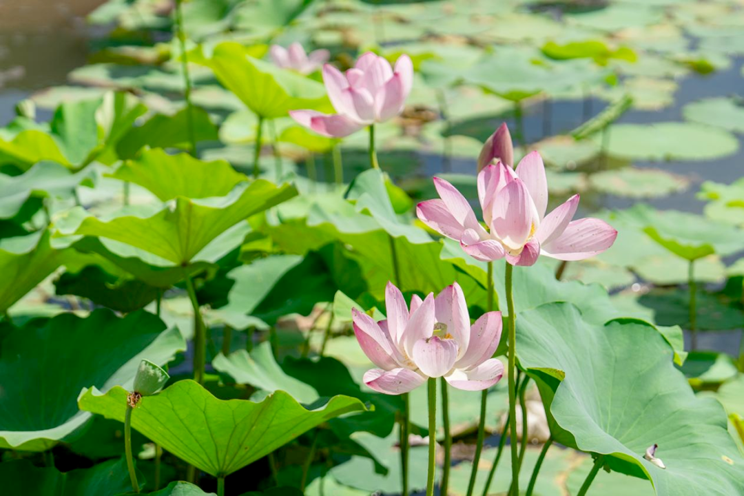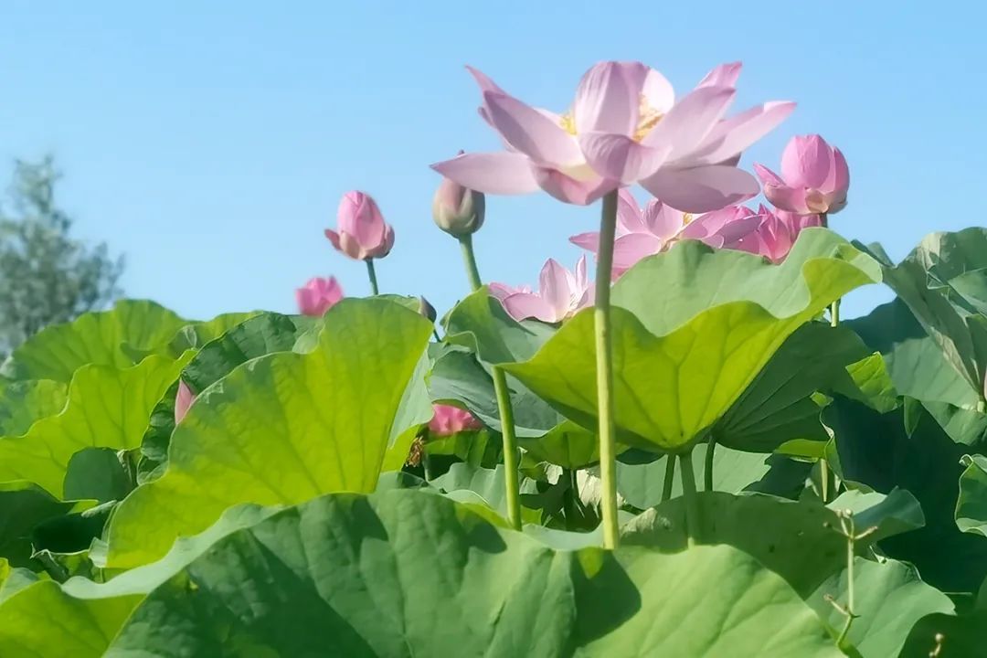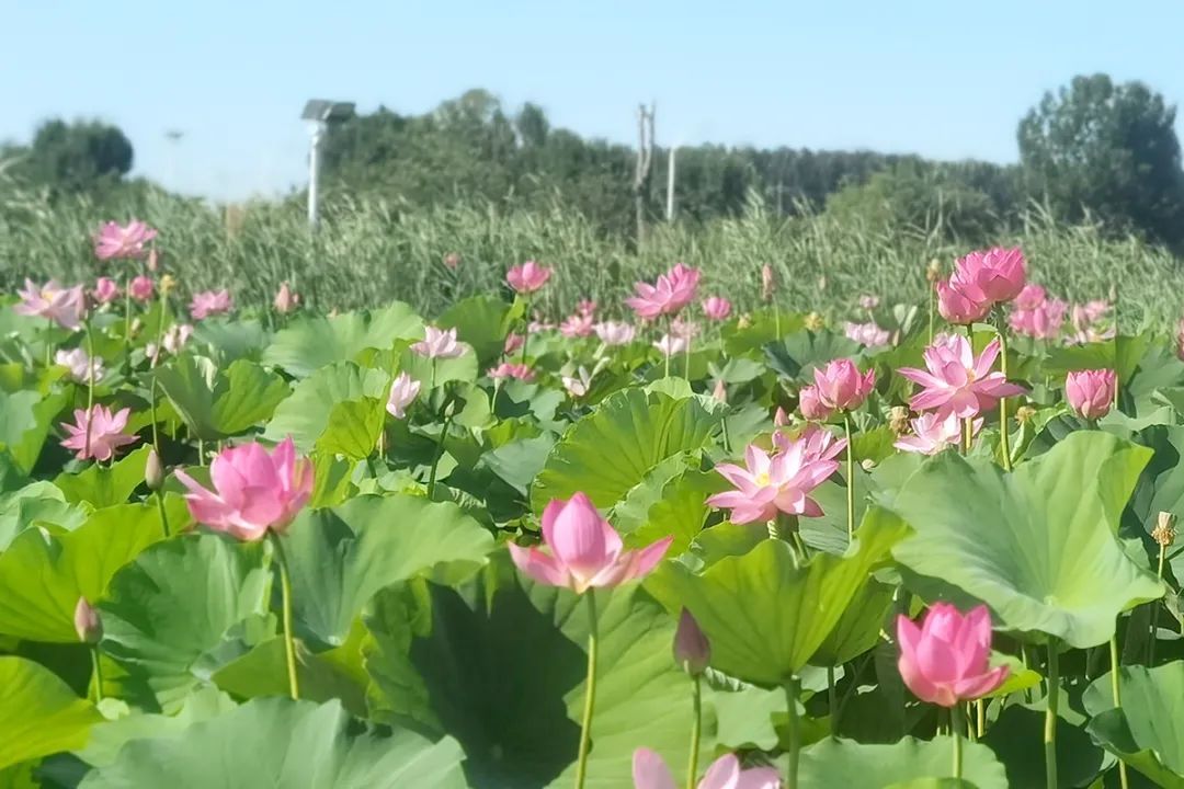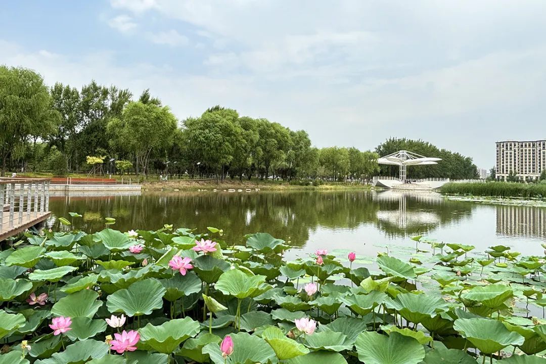 在大孙各庄镇绿道公园的荷花池内,一朵朵粉红、粉白色的荷花开得正艳,包含红宝石、仙女散花等多个品种。微风吹过,荷花随风摇曳,荷叶层层涌动,满眼都是诗情画意的模样。