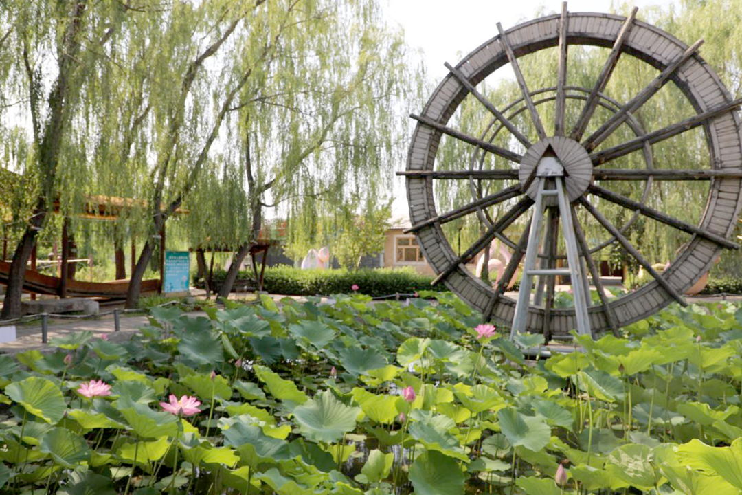 在南彩镇河北村民俗园,一朵朵荷花竞相开放,片片荷叶漂浮在水面,构成不可多得的夏日美景。漫步于此,清雅的荷香萦绕在鼻尖,荷花在水车的映衬下,显得愈发娇艳动人。