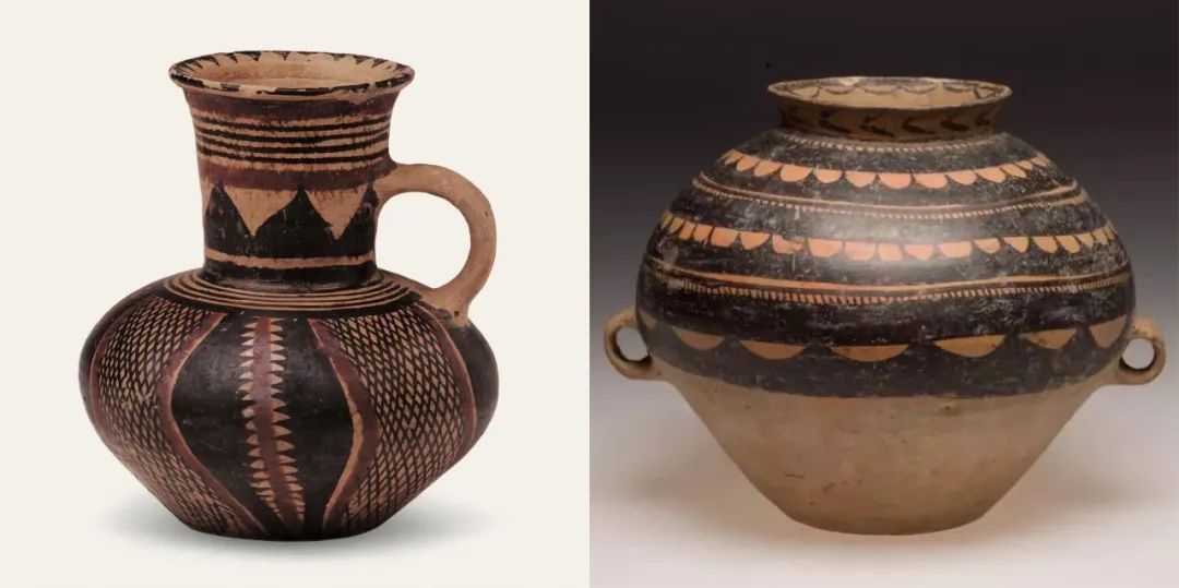 右:平行锯齿带纹彩陶罐,锯齿细密