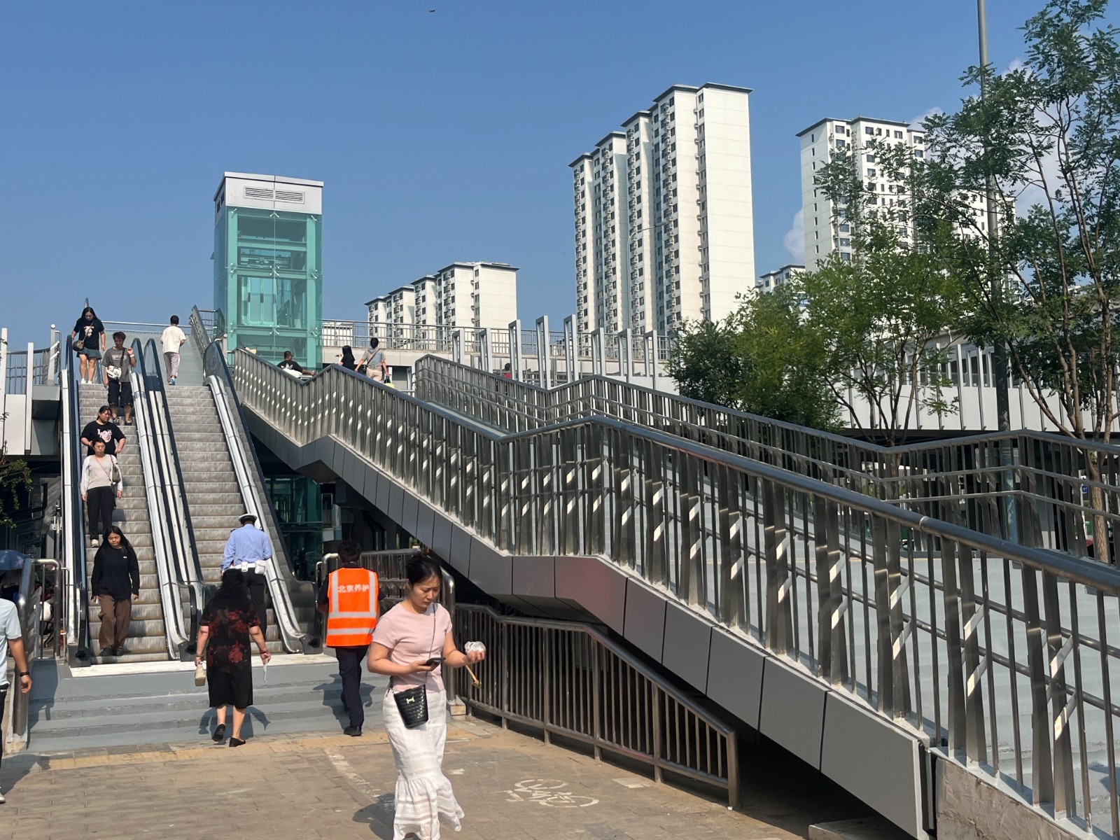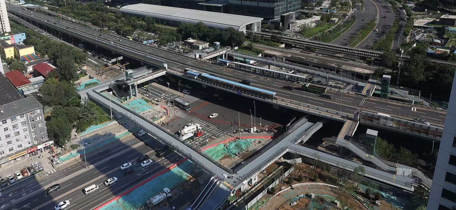 四个象限各设置一条1:2坡度梯道连接人行天桥与BRT主桥,全宽约3.8米,各设置一部垂直电梯作为无障碍设施连接地面、人行天桥与BRT天桥,同步拆除现状BRT梯道及无障碍坡道。
