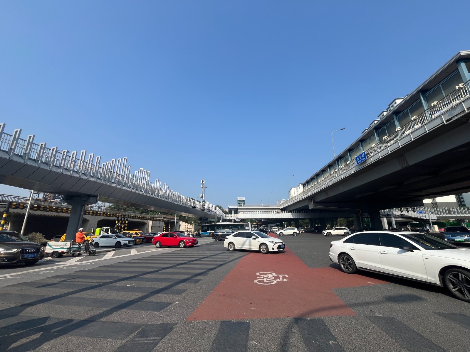 同时,位于金安桥桥区西北角,增设约2000平米非机动车停放区域,并与天桥同时启用。自北向南方向的非机动车可有序停放至该停车区,随后通过人行天桥到达地铁站。将大大缓解地铁金安桥站出入口周边的停车压力,释放更多步行空间。