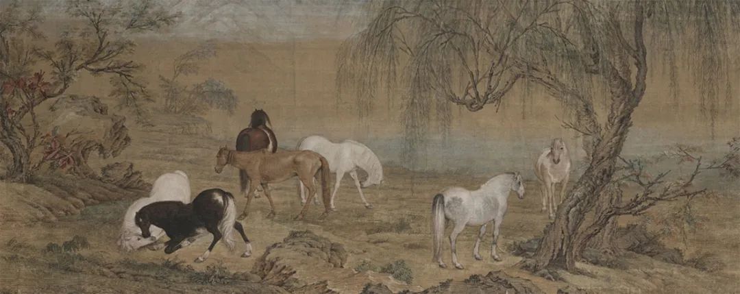 此卷又名《八骏图》,卷中绘有八匹骏马,它们或卧或立,或踱步嬉戏,悠然自得。在这片东西方艺术风格交融的郊原上,湖泊淡远,绿柳扶风。入清传教、随后成为宫廷画家的意大利人——郎世宁,以西方传统造型艺术的绘画技法,在艺术的二维空间中,刻画出颇具三维体积感、明暗变化的物象。姿态不同、形象各异的骏马,树木、山石与花草,展现在其创设出的幽远环境当中。此画不是简单写生,而是郎世宁对中国传统文化中人与马的象征关系的体悟。在古代,“千里马”象征着社会贤良人才。封建王朝的统治者命宫廷画家绘制骏马,是为传达其尊重人才、求贤若渴的期望。郎世宁所绘“八骏”源自周穆王拥有的八匹良骥,喻义王广纳贤士,彰显朝廷恩泽。