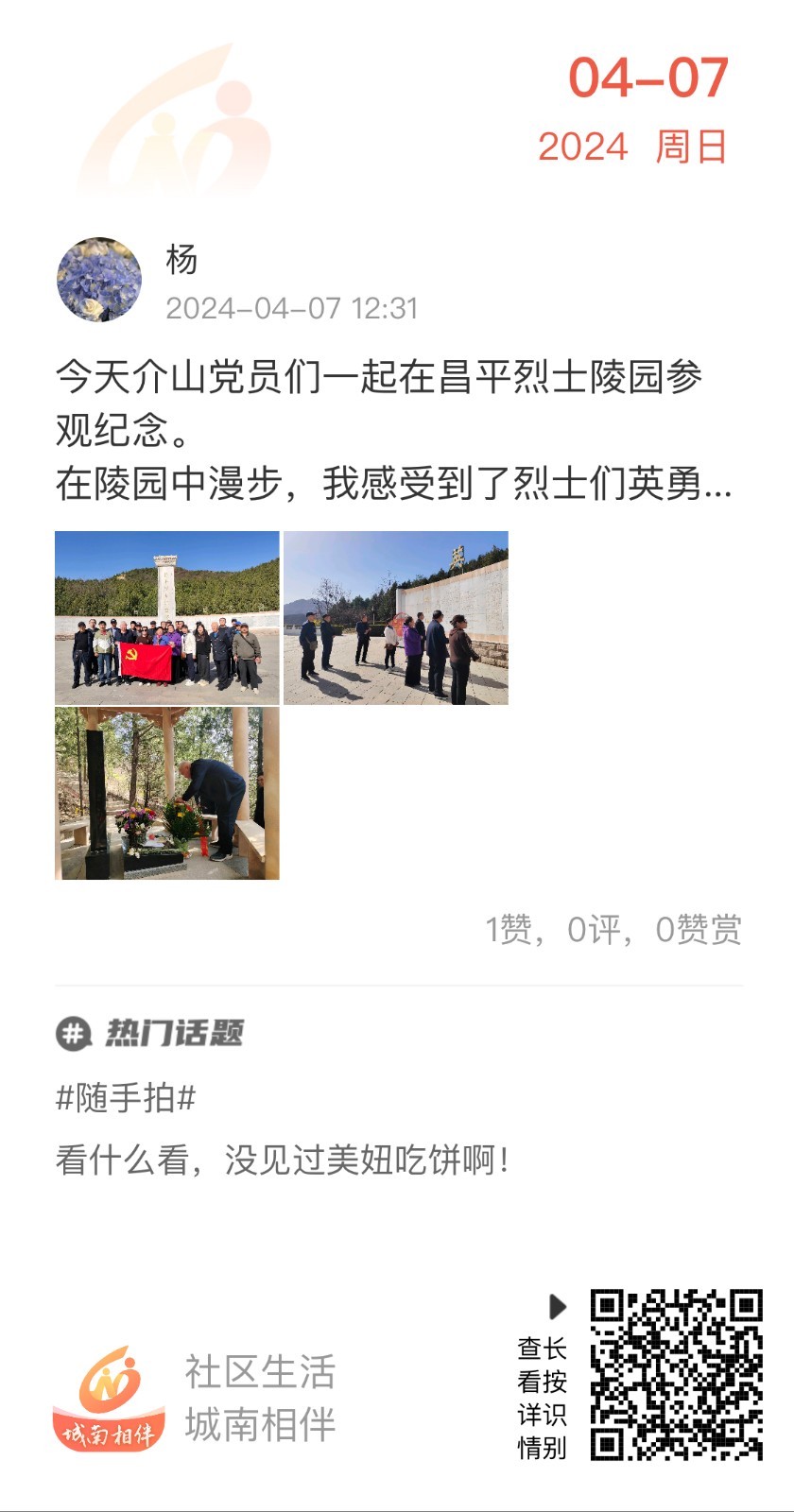 4月7日上午,介山社区党总支组织党员赴昌平烈士陵园开展清明祭扫主题党日活动,希望借扫墓之际回顾历史、重温历史,赓续红色血脉,从革命英烈事迹中汲取砥砺奋进力量。