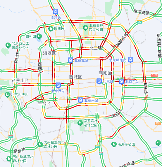 城区北部、东部、西部主要环路部分路段,莲石东路、阜石路、万泉河路、圆明园西路、学院路、通惠河北路等联络线出城方向,京承、京藏、京开、京港澳、首都机场高速、京通快速路等主要高速公路出京方向局部路段交通压力大。