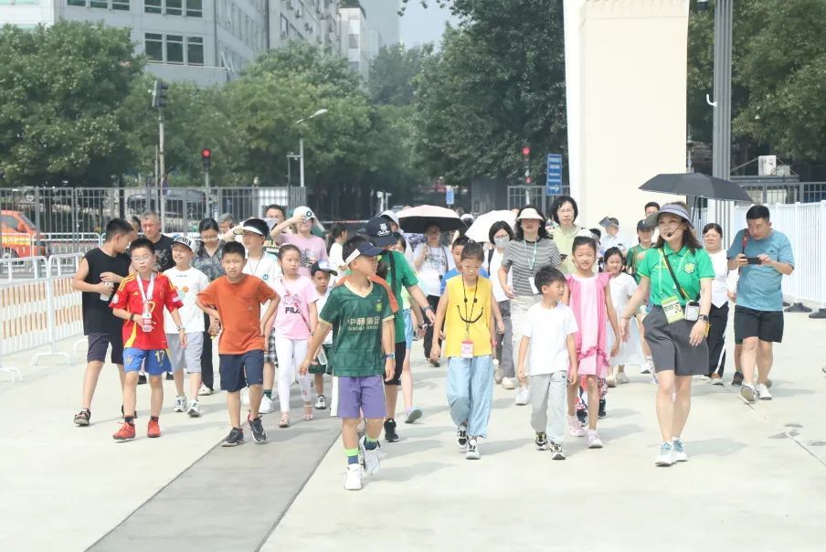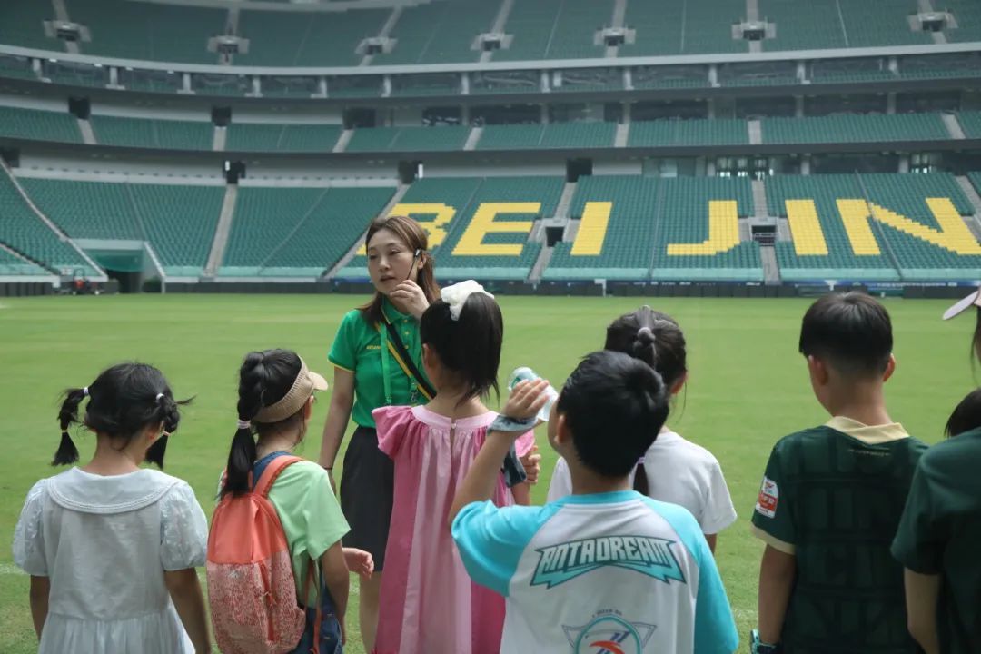 37度的高温也无法阻挡孩子们的热情。大家从工体西门进入场馆,一路上,工作人员讲解了新工体外墙的独特之处。