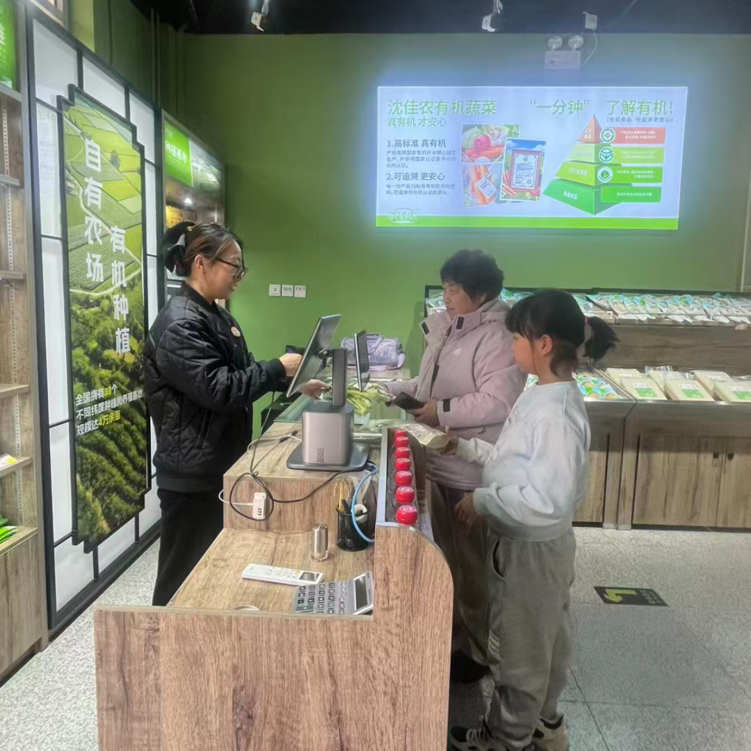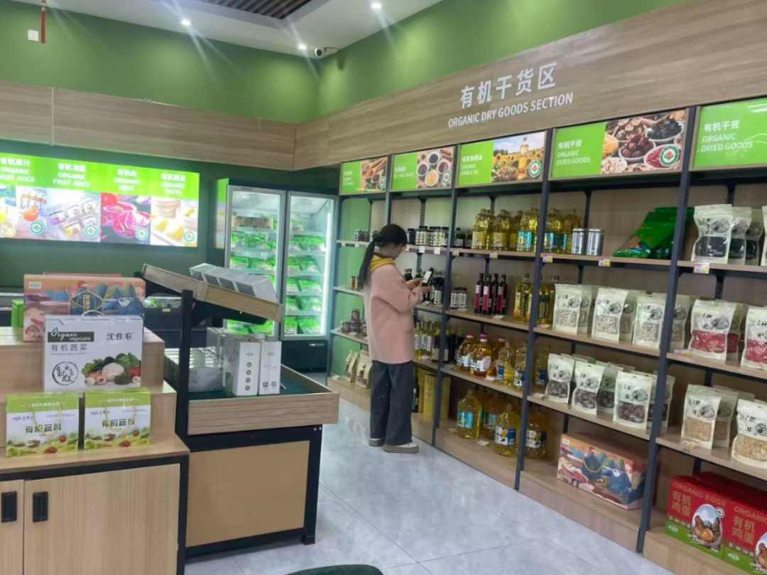 清晨的阳光洒进延庆百货大楼对面的绿富隆沈佳农有机生活馆,货架上码放着新鲜的延庆鲜玉米、有机蔬菜。一旁的展柜里陈列着来自各地的优质有机粮油、特色干货,玻璃罐里的干果蜜饯色泽鲜亮,引得前来选购的市民频频驻足。