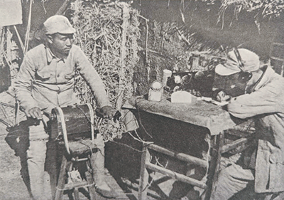 抗日战争时期,无线电通信广泛应用到晋察冀抗日根据地的敌后抗战中。图为晋察冀军区无线电训练班学员使用手摇发电机,保证电信联络畅通。