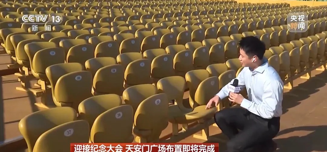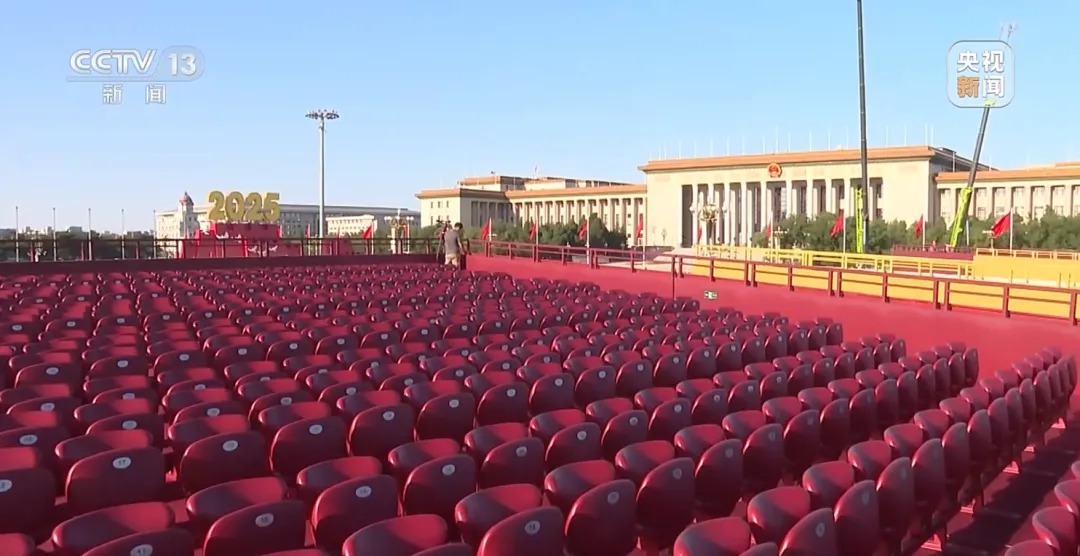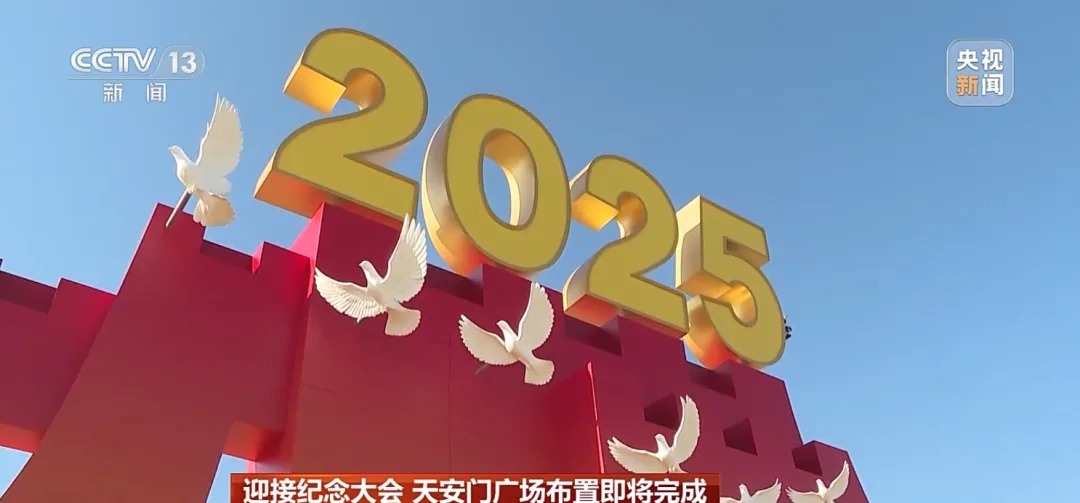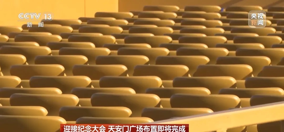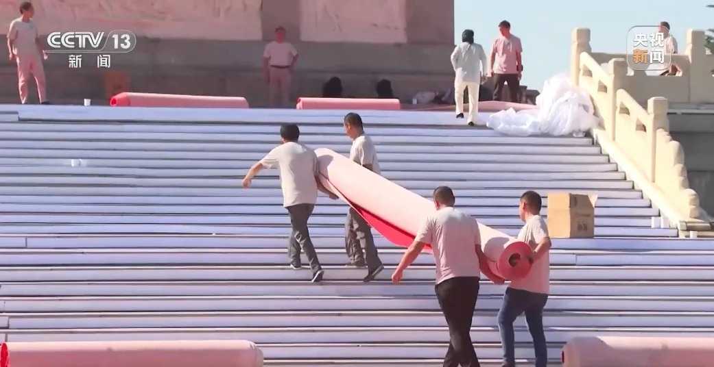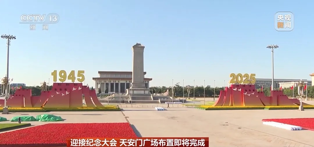 为迎接中国人民抗日战争暨世界反法西斯战争胜利80周年纪念活动天安门广场布置即将完成。