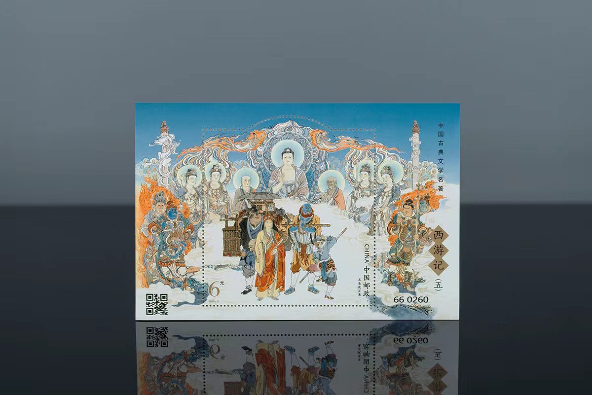 该套邮票是中国邮政自2015年发行的《中国古典文学名著——》系列邮票的第五组,描绘了小说第七十四回至第一百回的五段故事场景。4枚邮票分别表现孙悟空在狮驼岭大战青毛狮子、黄牙老象、大鹏雕三怪时激烈的打斗场景;孙悟空、猪八戒为救助被当作药引的比丘国众孩童,在南极仙翁帮助下收服白鹿精,擒杀白面狐狸的场景;哪吒随孙悟空去陷空山无底洞,擒获欲强迫唐僧成亲的金鼻白毛老鼠精的场景;孙悟空领着月宫主人太阴星君来到天竺国,收服假冒公主的广寒宫捣药玉兔的场景;小型张表现了师徒四人和白龙马取回真经后,真身返回灵山,五圣终成正果,共登极乐的场景。画家运用传统工笔重彩的手法,同时注重以形写神,人物刻画逼真传神,在方寸间生动地演绎出大家熟知的故事情节。