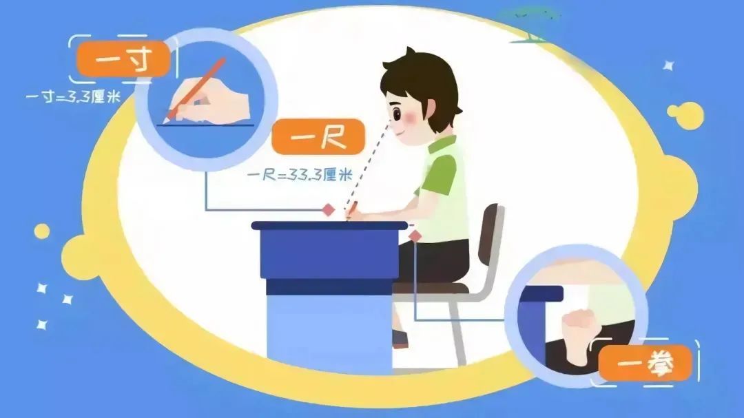 读写姿势要端正防控要点请记牢学生阅读书写时,桌椅高度要合适,做到书本离眼睛一尺(约33厘米)、胸口离课桌一拳(约10厘米)、握笔手指离笔尖一寸(约3厘米)。