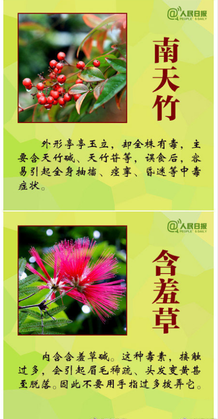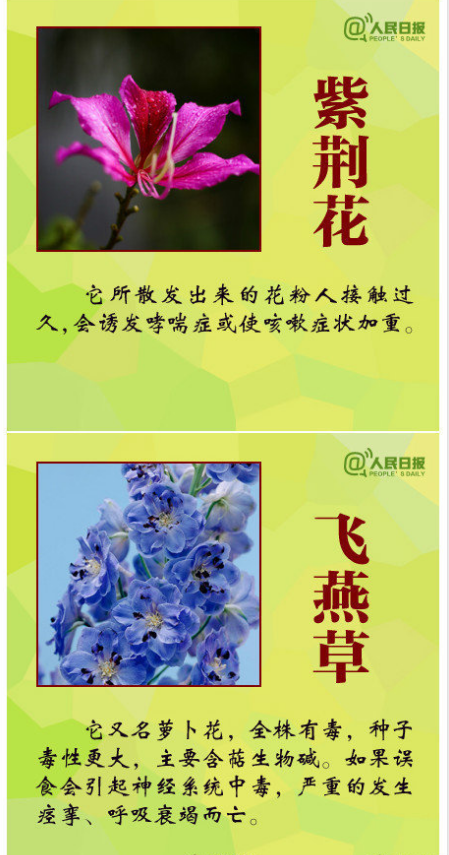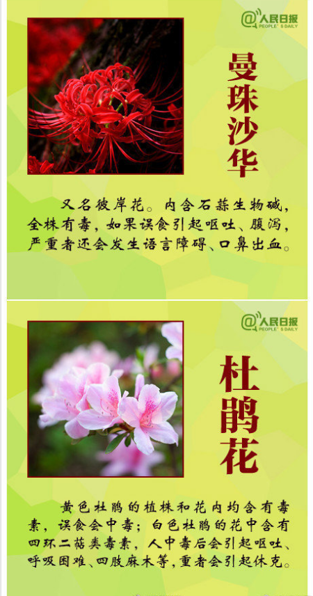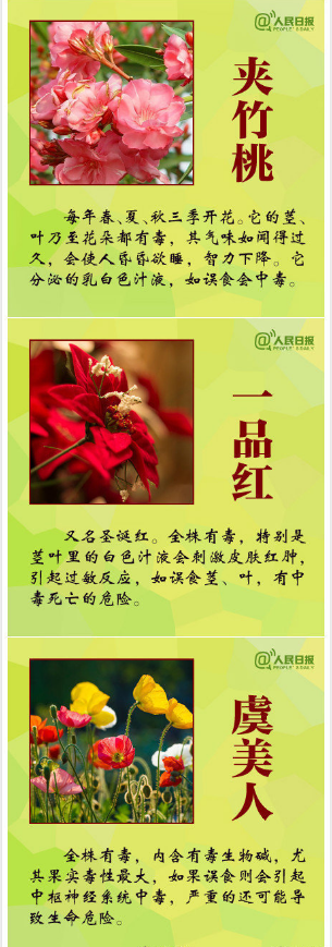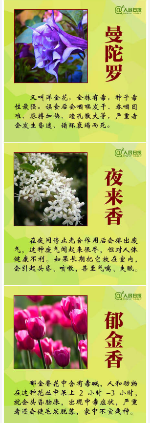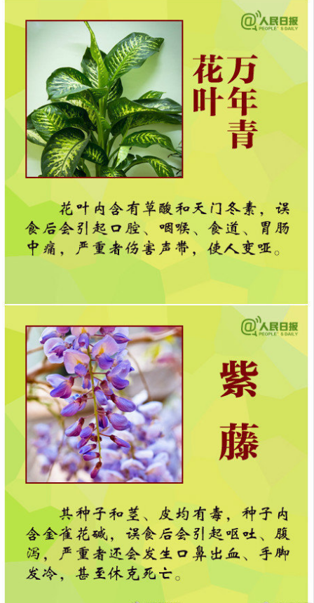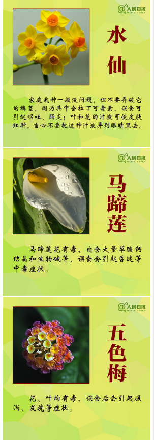 有些花卉植物看起来十分漂亮,但其实毒性很强。专家强调,野外的花卉植物即使认识也不要采回家食用,观赏植物不是果树,很多都有毒性,且其专用肥料和农药还有可能造成果实中重金属富集,千万不能吃!家养水仙和滴水观音毒性大,家有小孩一定要注意!