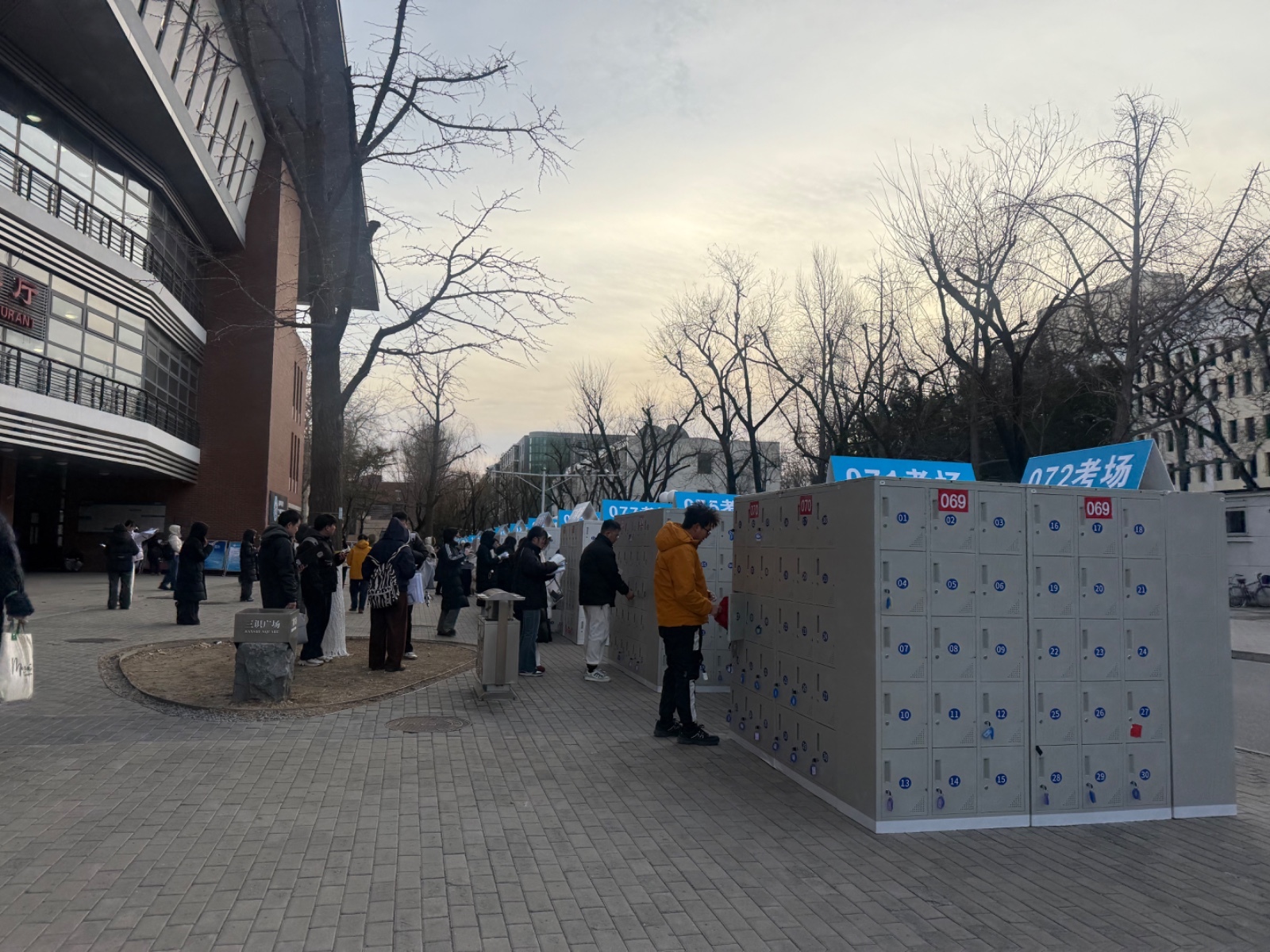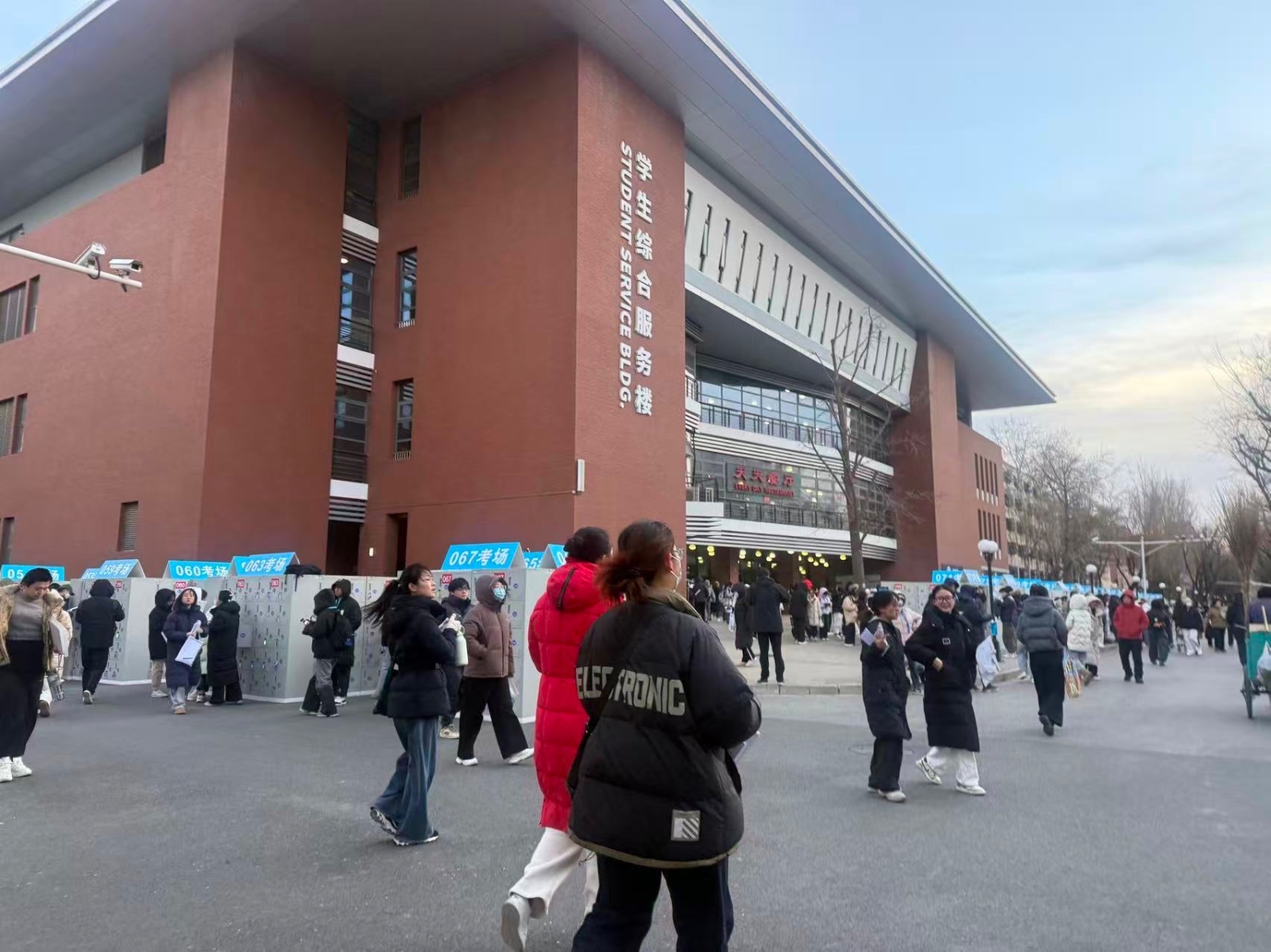 数据显示,考试期间,北工大考点考生共3408人。北工大考点启用第一教学楼、第二教学楼两栋考试大楼,设置常规考场120个,备用考场6个。记者在现场看到,考试大楼外排队区域,御寒帐篷有序搭建,让考生们有了温暖的等候空间。旁边停放的 “热饮车” 旁,有考生正在用保温杯接姜糖水,驱散寒意。还有不少考生在物品存放处,抓紧最后时间翻看着用彩色笔画满重点的复习材料,争分夺秒地复习。今年为了方便考生,北工大配备了4000余个物品存放柜,考生按照考场号、座位号就可以找到个人专属物品存放柜,每个存放柜上都配备钥匙,考生自行保管、随放随取。北工大副校长李建荣介绍:“我们也力所能及地做一些暖心服务的工作,包括我们开辟出食堂的两层楼,供同学们休息,也准备了4000多个储物柜,能够做到一人一柜,同学们可以把他的物品放到柜子里边去,同时我们也提供了一些热饮,还有餐食等等这些服务。”