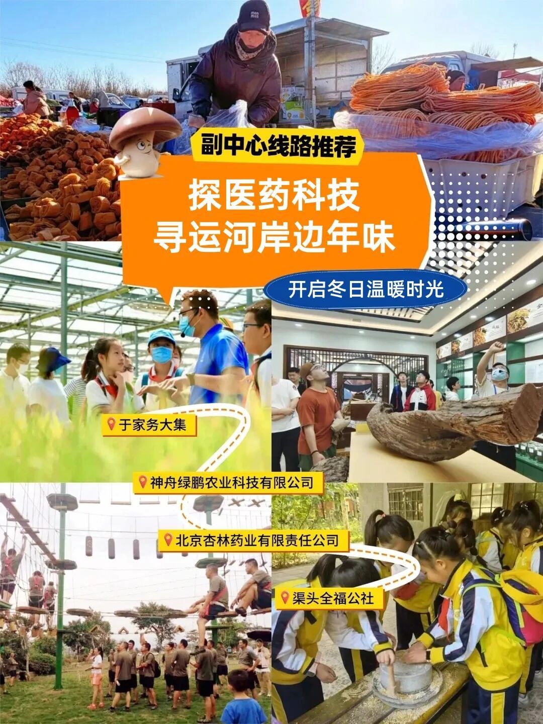 核心亮点:来到于家务回族乡,体验独特的运河大集烟火气,寻找传统年味。同时,深入航天农业科技园,触摸“太空种子”,在杏林中医药文化科普园解密草本智慧。这条线路完美融合了田园野趣、农业科技与中医药文化,让孩子在亲近自然的同时领略科技对农业的革新。
