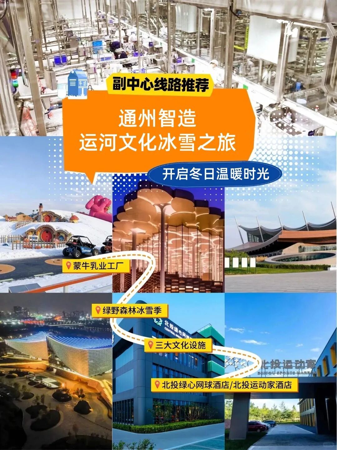核心亮点:在现代化工厂探秘一盒牛奶诞生的全过程,了解食品工业与循环经济理念。随后,前往冰雪乐园尽情嬉戏,拥抱冬日自然。最后,漫步千年运河畔,打卡剧院、博物馆、图书馆三大文化设施,一天之内收获工业探秘、冰雪乐趣与文化熏陶三重体验。