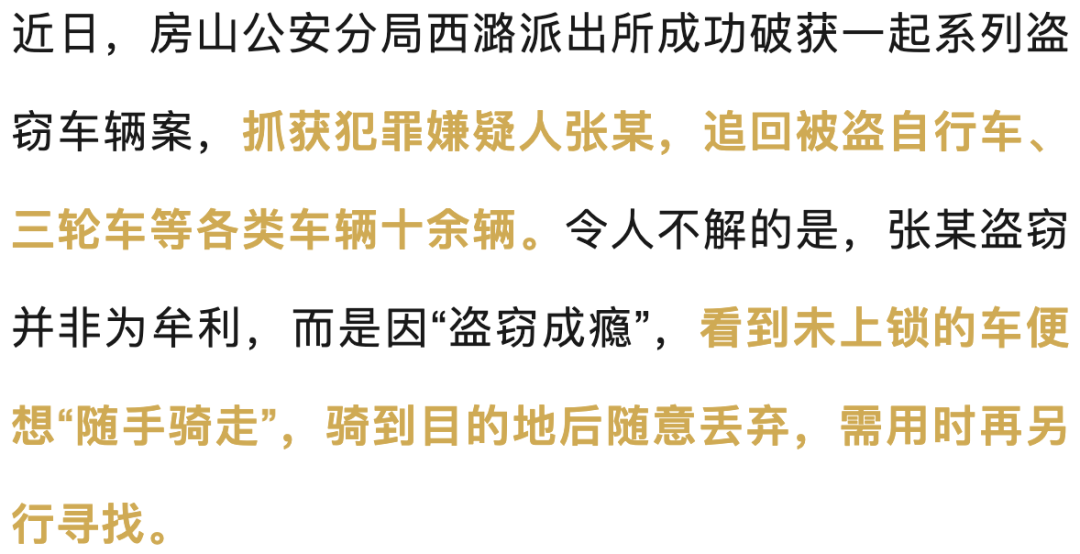 不知从何时起,他滋生了盗窃未上锁车辆的念头,起初只是想找个代步工具,久而久之竟形成依赖,看到路边未上锁或长时间没人骑的自行车、三轮车,就忍不住顺手牵羊。