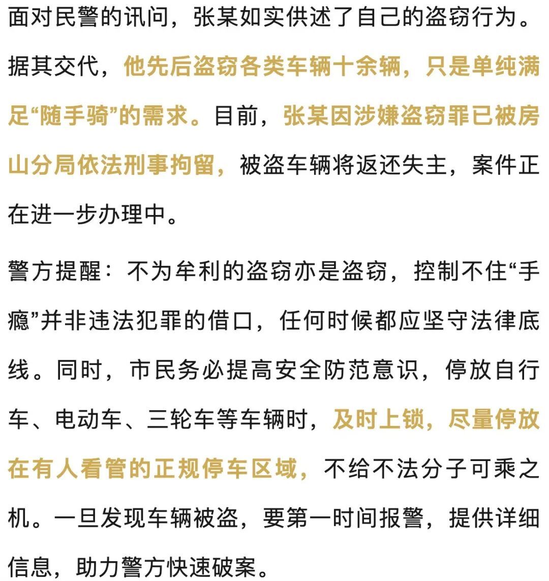 今年8月,张某来京务工,因求职不顺陷入困境。手中积蓄耗尽后,他未选择向家人求助或积极寻找工作,11月以来,就靠捡拾废品勉强维持生计。 不知从何时起,他滋生了盗窃未上锁车辆的念头,起初只是想找个代步工具,久而久之竟形成依赖,看到路边未上锁或长时间没人骑的自行车、三轮车,就忍不住顺手牵羊。